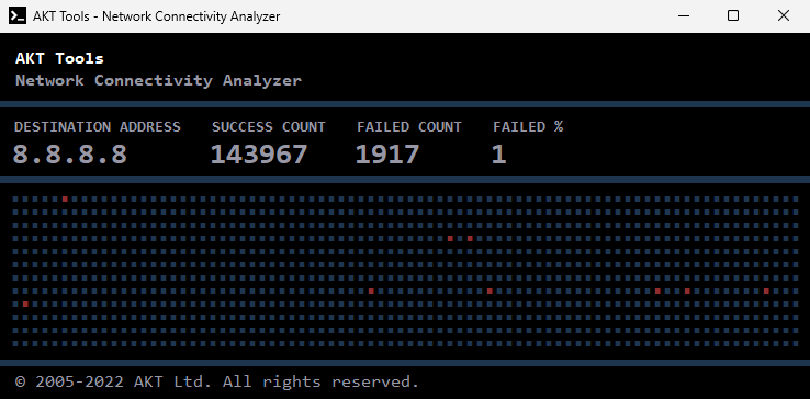 Highlights: | 1. | Multiple instances can be run simultaneously for different destination address | | 2. | Enter destination address - IP address, NetBIOS name | | 3. | Destination list is maintained for reuse of destination in future | | 4. | Log is saved on client machine for future reference | | 5. | Available in 3 modes - Fullscreen, Compact and Clock | | 6. | Pause & resume test | | 7. | Test interval can be customized | | 8. | Cutoff test count can be set |