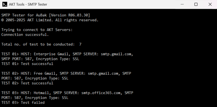 Category 2 - Internet and local configuration: | 1. | Internet Level ISP (Internet Service Provider) has blocked SMTP ports | | 2. | Network Level Firewall or Wi-Fi router settings are blocking SMTP ports | | 3. | Machine Level Windows Firewall or Anti-Virus are restricting sending emails or blocking ports, or you need to white list 'AuBak.exe', 'AuBak Backup Engine.exe' and 'AuBak Gateway.exe'. |
